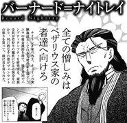 Bernard Nightray (バーナード=ナイトレイ, Bānādo Naitorei) is a minor antagonist from Jun Mochizuki's Pandora Hearts. He is the head of the Nightray Dukedom, and thus the father of Elliot and his siblings Fred, Claude, Ernest, and Vanessa. He is also the adoptive father of Vincent and Gilbert Nightray. As the descendent of the "Traitor Duke," Bernard has a long-standing generational grudge against the Vessaliuses, being the one who taught Elliot to resent all those from that bloodline regardless of any other circumstances.