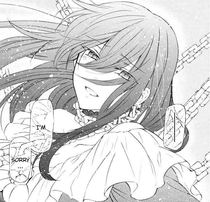 As they continue to fall through Lacie's memories, Oswald finds himself staring at the memory of when he dropped Lacie into the Abyss. Oz arrives on the scene, realizing what he's looking at as the Chains of Condemnation wrap themselves around Lacie. A shocked Lacie then looks to and addresses Oswald's present incarnation, rather than the incarnation of said time. Oz is shocked that Lacie can see them with her Eyes of Ill Omen as they fall through time, as Lacie apologizes to Oswald. With the memory drifting past, Oswald finally understands that Lacie had been addressing his future self at the time of her judgement - however he can't fathom why Lacie was apologizing to him when it seemed as though she had everything figured out at the time, begging her to not smile at him with such a troubled look on her face as tears drip down his face.