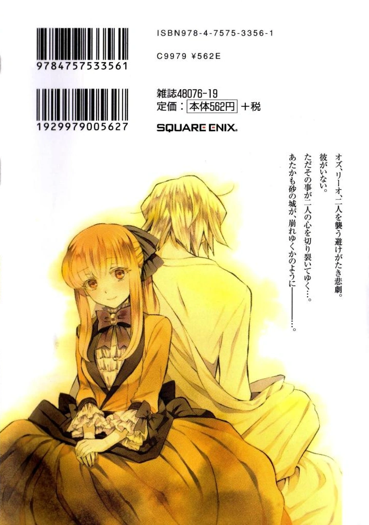 The back cover features several of the main characters, such as Oz, Alice, Gilbert, Break, Sharon, Elliot, Leo, and Emily, all in chibi form. All of them are falling from above amidst a shower of yellow flowers, all bathed in a warm golden light. Oz, Alice, and Gilbert are all falling together, Gilbert clinging to Oz's hands with panic as the latter drops down with a bright smile, and Alice clings to Gilbert's back while holding up his hat. Break is holding his cane sword up above his head, lips pursed playfully as he looks up at Emily falling above him, while Sharon clings to him in her surprise. Leo sits on Elliot's back reading a book as they fall.