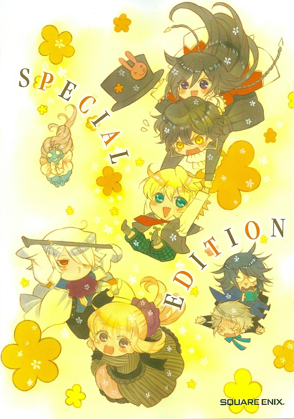 The Special Edition's front cover features Leo, hair still long and shaggy like in his initial appearances. He's dressed in his Lutwidge Academy uniform, and he has on his glasses as well. He's sitting down with his knees tucked up to his chest, open book in his lap, his right hand adjusting his glasses as he looks upward at the camera and smiles. He's surrounded by a background of pink, yellow, and blue flowers