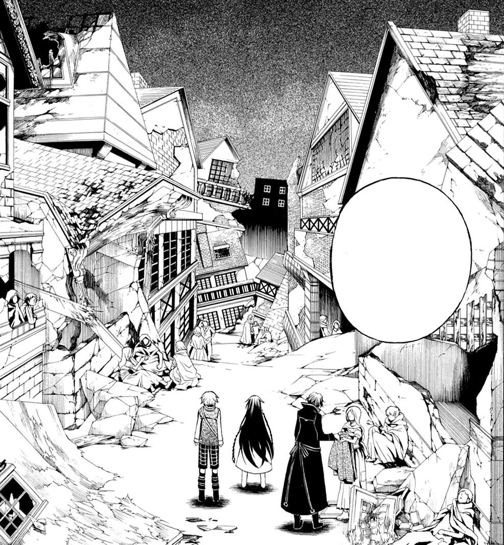 The deeper and more center the area, the more potent the Abyssal energy that seeps into the air. Occasional there will be humans who are either too curious for their own good, or have been forced to go in (usually by Pandora), and have their bodies become grotesquely warped and dwell in the darkness of the Hole. And just as those unfortunate bodies become warped beyond recognition, reality itself starts warping heavily upon crossing a certain threshold into the Hole. The powers of the Abyss will create illusions based off memories from the past, turning its dark and ruined landscape into a phantom of the city that used to live there. If the person experiencing these "memories" has history with Sablier, the things they see will reflect that.