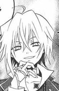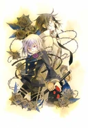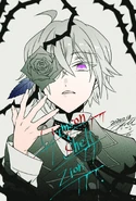 Shion has short white hair that reaches his neck and light purple eyes. When he was in his Red Rose uniform he wore a white, long sleeved, buttoned up coat with red lining and black pants with a checkered pattern on the bottom. His shoes are white boots that go past his ankles and wears a checkered bracelet on his right arm. When he appeared in his normal attire Shion wore a black jacket with double buttons and long sleeves with a purple rose around his neck hung on string. Underneath is a white collared, long sleeved shirt which shows his Black Rose brand along with black pants and knee-high black boots.