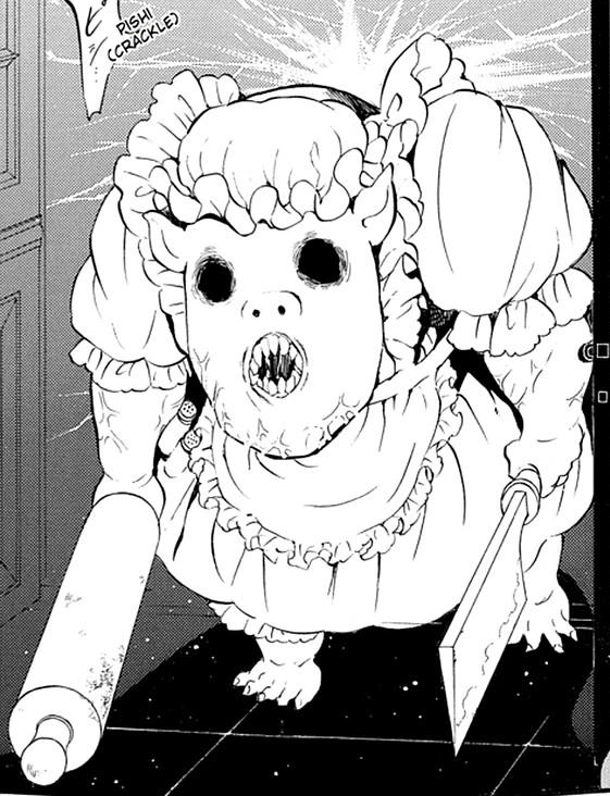 After the Chains supporting the world were severed by Jack Vessalius, the Cook finds itself able to break through the Path and wrench open a crack that formed in the sky over the city of Sablier. Once in the 1st Dimension, The Cook ventures into the dark city, which had sprouted in the Hole of Sablier as a result of Jury's power. Soon after its arrival, The Cook comes across a store with two young women in it: Noise and Ada. Seeing only Noise, The Cook targets her as nothing more than something to consume, entering the store behind Noise and immediately attacking her.