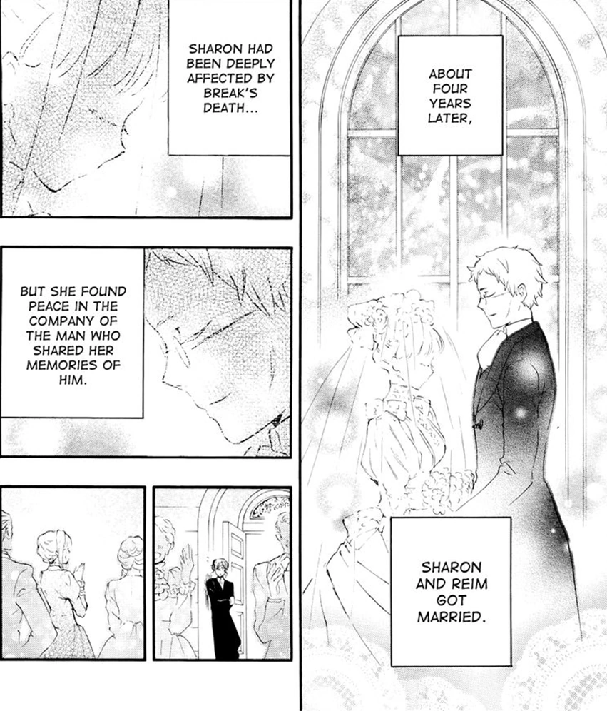 Moving forward, Gilbert explains that Sharon experienced some surprising changes after her return, as she began to notice that her body was starting to age again. Lamenting on how he'd used the word miracle when Oz departed, the true miracle had already happened, allowing Sharon to marry Reim four years later. Although the scars from Break's death ran deep, Gilbert believes that the time Sharon spent with Reim was very peaceful as a result of the memories they shared. At the wedding, Gilbert couldn't help but notice Ada - who happy cheered for Sharon in the audience. Gilbert then states that Ada had waited for Vincent for a long time, and upon Vincent's request Gilbert told Ada that his brother had died - though because he's such a bad liar, Gilbert was sure that Ada could see through him easily. Despite that though, Ada just stood there without saying a single word. Vincent reasoned that as a Baskerville he couldn't walk along the same path of time as her, so to take any other action would be selfish of him - though Vincent hoped that Ada would find happiness someday with someone else. Vincent is then shown watching Ada from afar as she enjoys her life with another man, smiling before taking his leave just as Ada looked up in his direction.